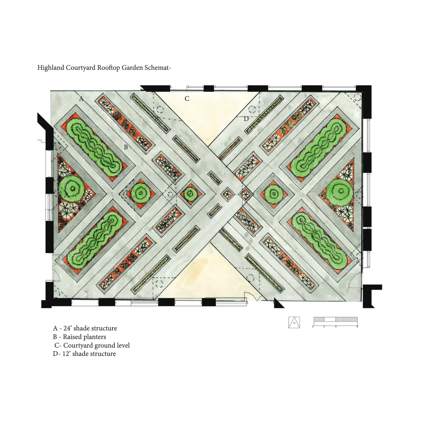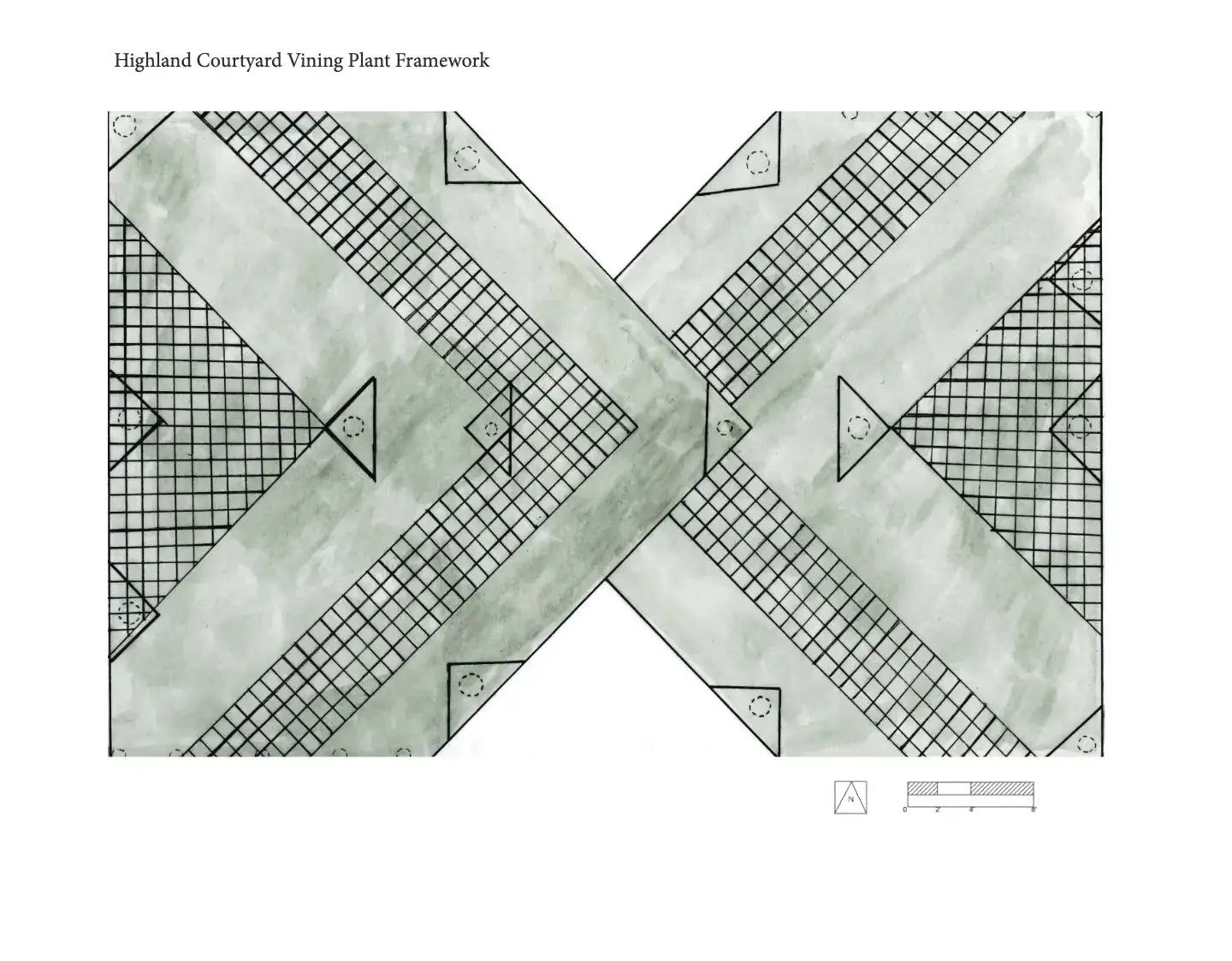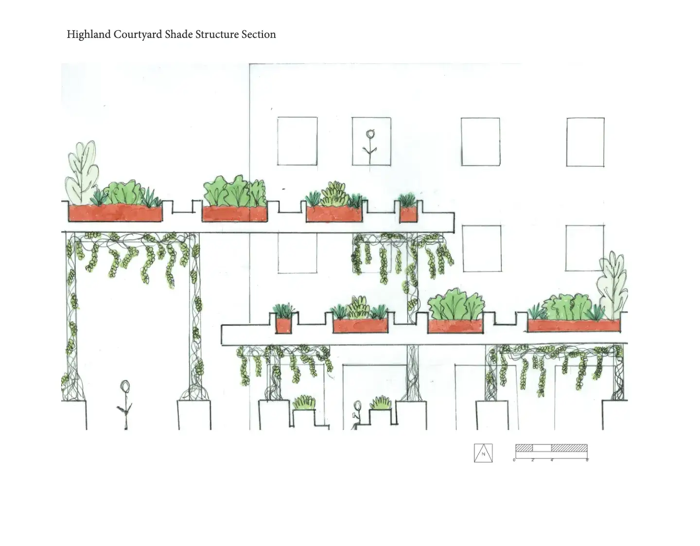 This project was a complete re-imagining of the Highland Courtyard on the University of Arizona campus. Used primarily as a pedestrian passage way, my design incorporated shade and ground level seating for those utilizing the marketplace. The heart of my design was found the world created above the courtyard's pedestrian traffic; a pollinator stopover habitat on top of the shade structures.